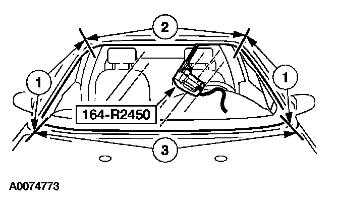 10. Install the special tool into the top of the windshield glass and inflate. Cut the urethane adhesive from corner to corner along the bottom of the windshield glass.