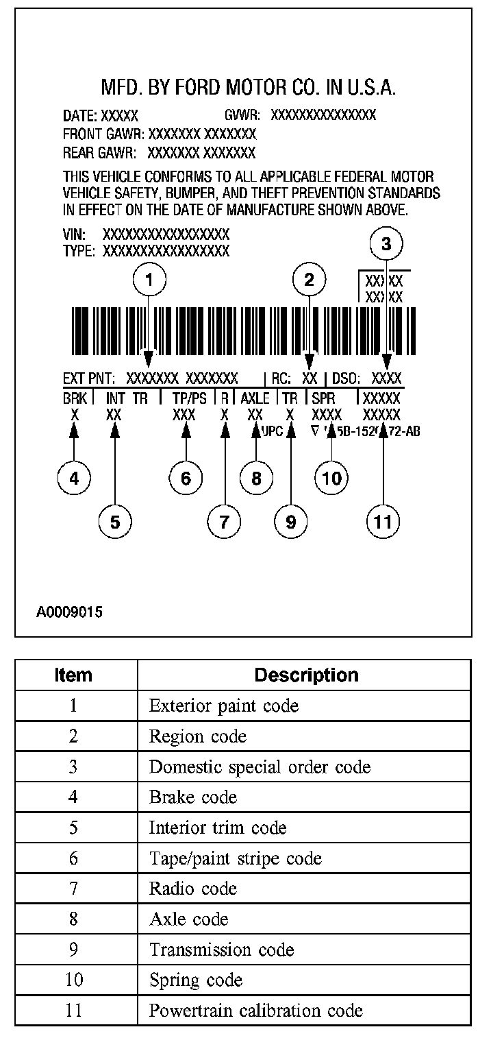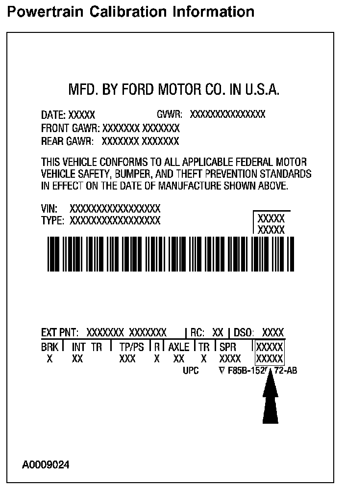 Powertrain calibration information is printed in the lower right corner of the vehicle certification (VC) label. Only the base calibration information is printed. Revision levels will not appear, however, they can be found in On Line Automotive Service Information System (OASIS).