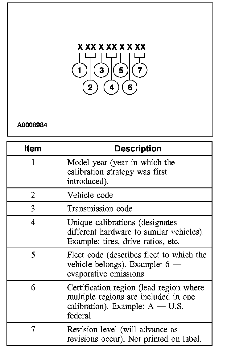 NOTE: Powertrain calibration information is limited to a maximum of five characters per line on the vehicle certification (VC) label. Because of this, calibration identification consisting of more than five characters will wrap to the second line on the VC label.