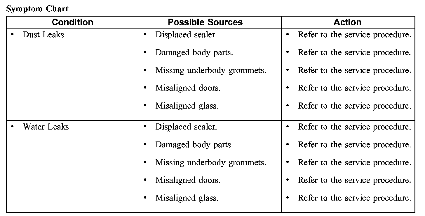 After the road test, check for indications of a dust pattern around the door openings, cowl side trim panel, lower part of the quater panel and in the luggage compartment.