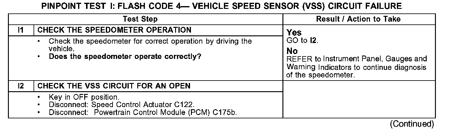 PINPOINT TEST I: FLASH CODE 4 - VEHICLE SPEED SENSOR (VSS) CIRCUIT FAILURE