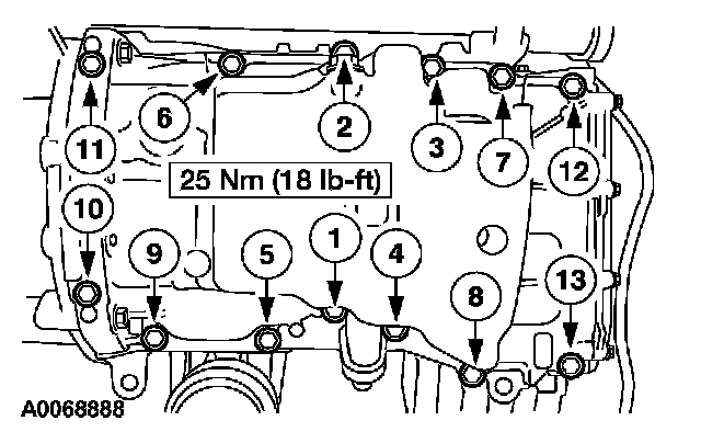 12. Install the remaining oil pan bolts and tighten the oil pan bolts in the sequence shown.