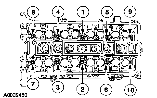 Install the cylinder head and 10 new bolts. Tighten the bolts in the sequence shown in five stages.