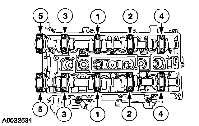 Install the camshafts and bearing caps in their original location and orientation. Tighten the bolts in the sequence shown in three stages.
