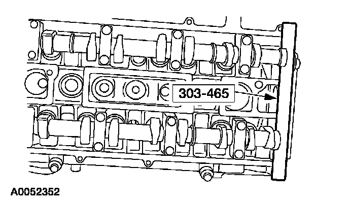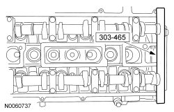 34. CAUTION: The special tool 303-465 is for camshaft alignment only. Using this tool to prevent engine rotation can result in engine damage.