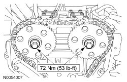 Using the flats on the camshafts to prevent camshaft rotation, tighten the bolts.