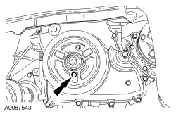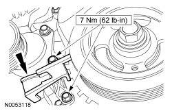 Install a new crankshaft pulley bolt. Using the special tool to hold the crankshaft pulley in place, tighten the crankshaft pulley bolt in two stages: