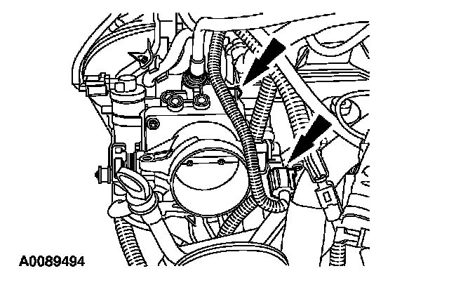 21. Disconnect the Throttle Position (TP) sensor electrical connector and wiring harness pin-type retainer.