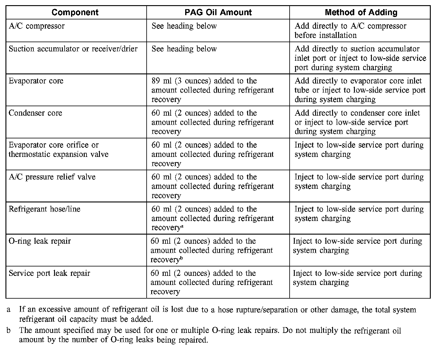 CAUTION: During normal A/C operation, oil is circulated through the system with the refrigerant, and a small amount is retained in each component. If certain components of the system are removed, some of the refrigerant oil will go with the component. To maintain the original total oil charge, it is necessary to compensate for the oil lost by adding oil to the system with the new part.