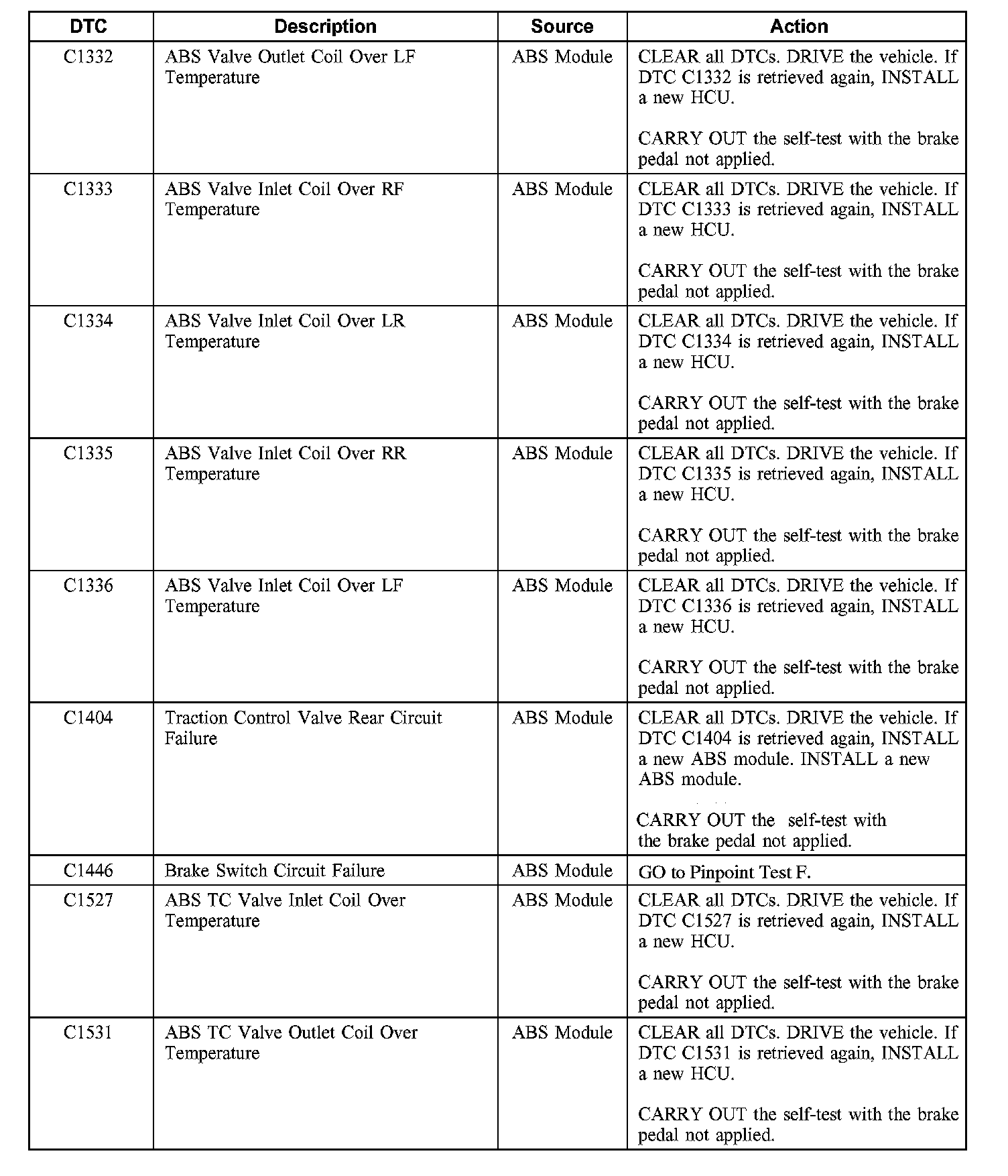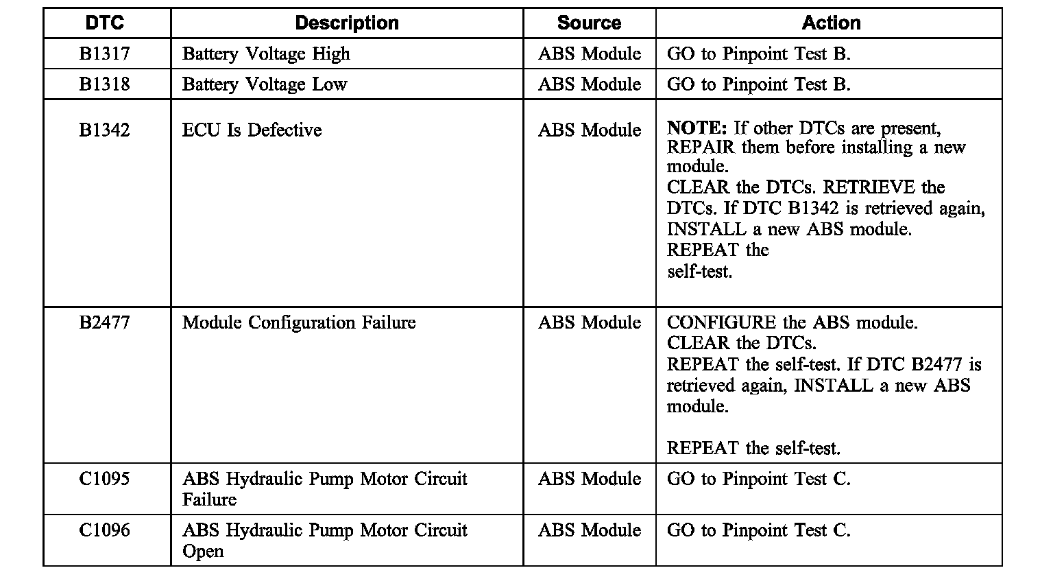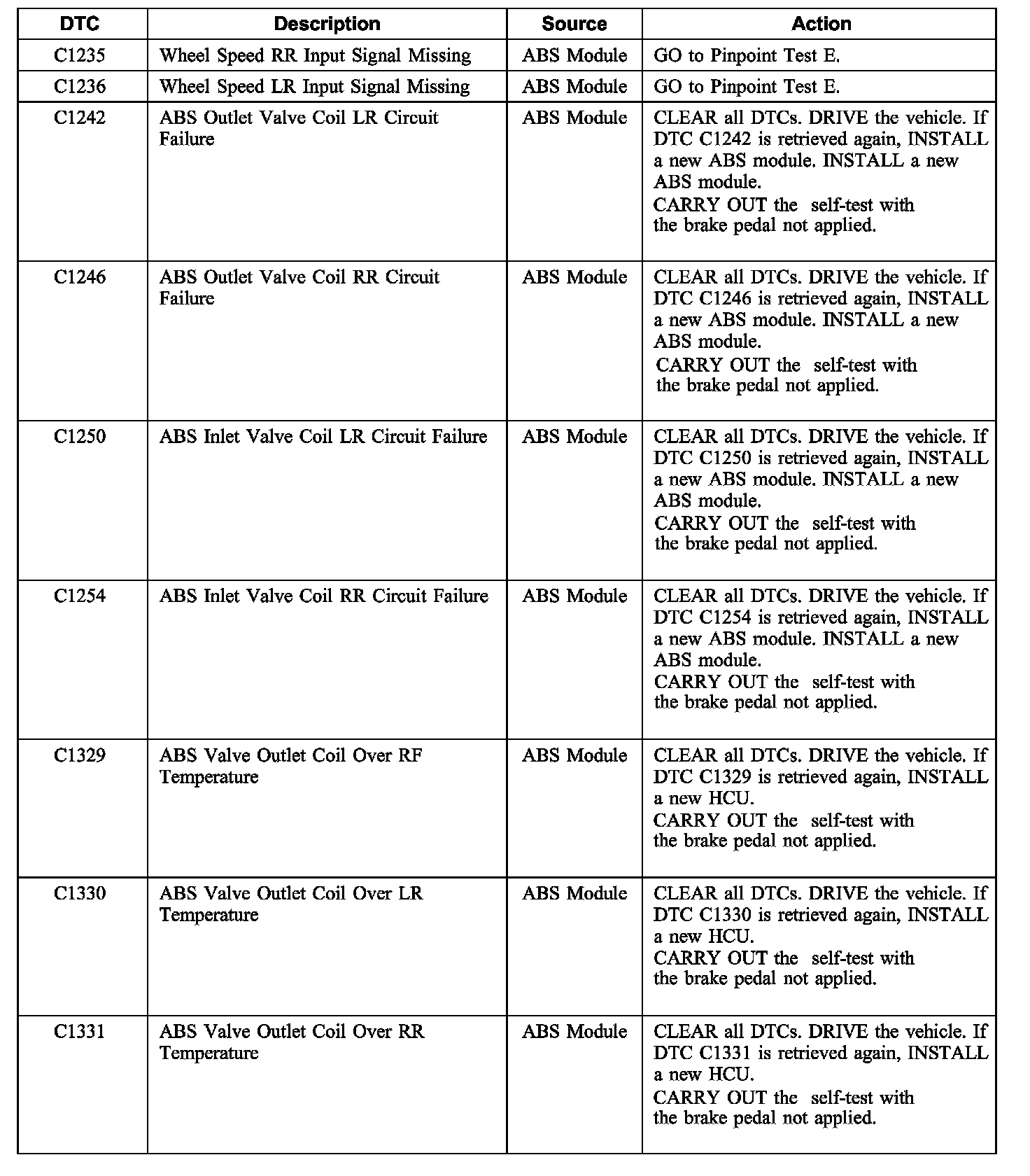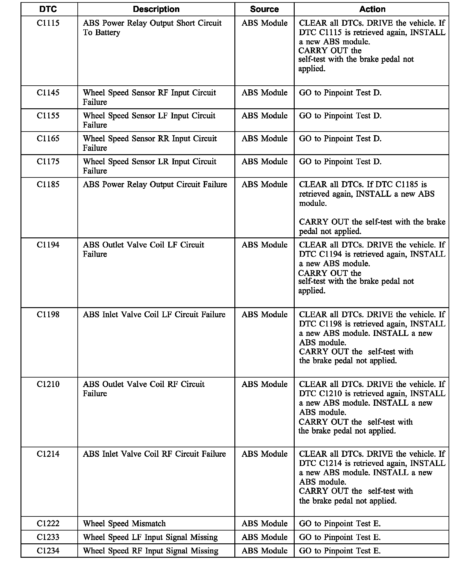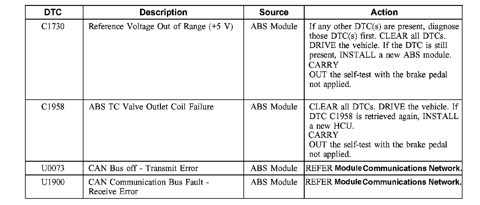 AntiLock Brake System (ABS) Module Diagnostic Trouble Code (DTC) Index