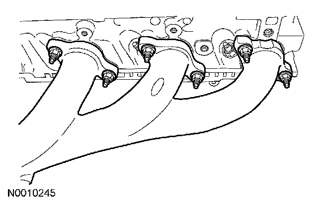 100. Position a new RH exhaust manifold gasket and the RH exhaust manifold. Install the 6 nuts.
