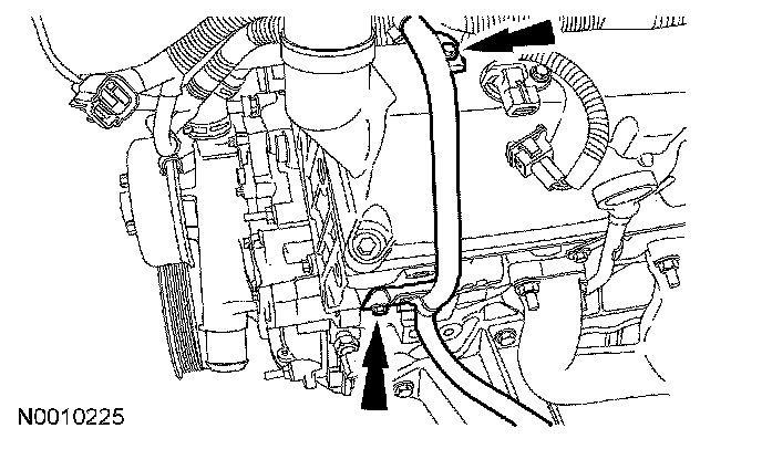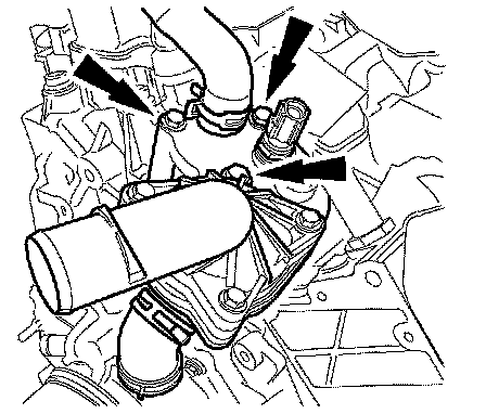 107. Position the thermostat housing, hoses and coolant tube. Install the 3 bolts.