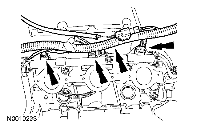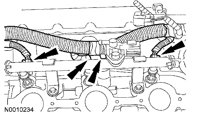 122. Position the fuel rail supply tube brackets and install the 2 bolts.