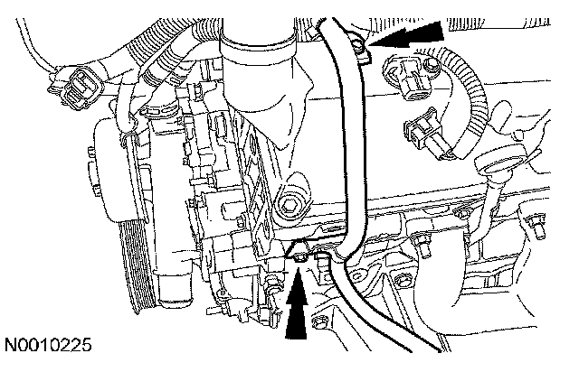 27. Remove the bolt and then disconnect the coolant bypass hose and the heater hose from the coolant pump.
