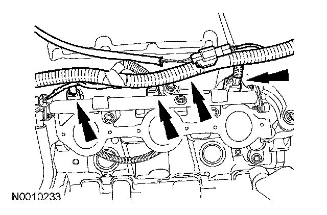 25. Remove the 4 bolts and then remove the fuel rail and injectors.