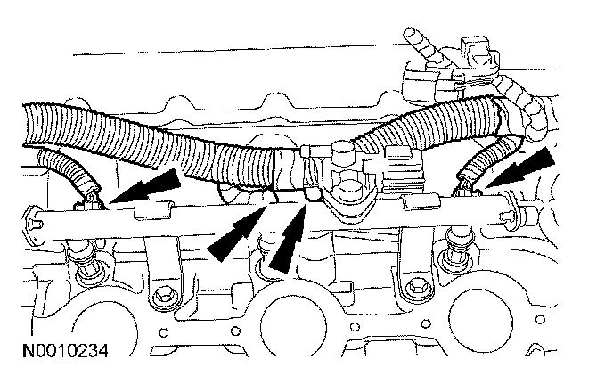 CAUTION: If the fuel rail is used as a leverage device, damage may occur to the fuel rail. Care must be taken when working around the fuel rail.