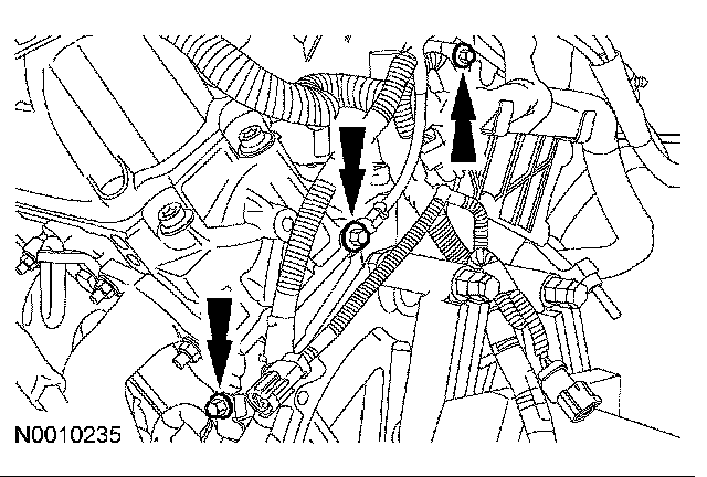 24. Remove the 3 bolts, detach the wiring retainers and remove the main engine wiring harness.