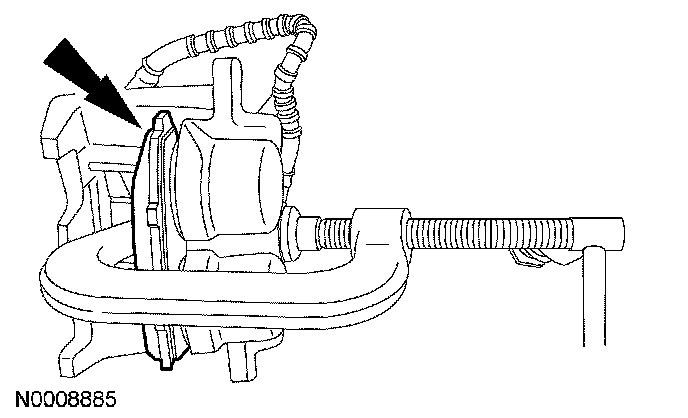 CAUTION: Do not allow the brake fluid to come in contact with the adhesive backing on the brake pads. If brake fluid is spilled onto the brake pads new pads must be installed.