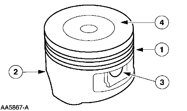 1. Clean and inspect the (1) ring lands, (2) skirts, (3) pin bosses, and the (4) tops of the pistons. If wear marks, scores or glazing is found on the piston skirt, check for a bent or twisted connecting rod.