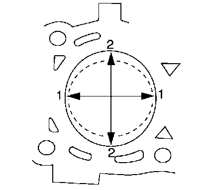 1. Measure the cylinder bore in two directions. The difference is the out of round. Verify the out of round is within the wear limit and bore the cylinder to the next oversize limit.
