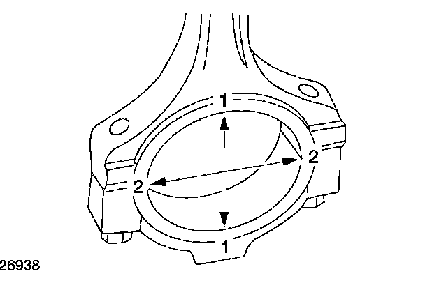 1. Tighten the bolts to specification, then measure the bore in two directions. The difference is the connecting rod bore out of round. Verify the out of round is within specification.