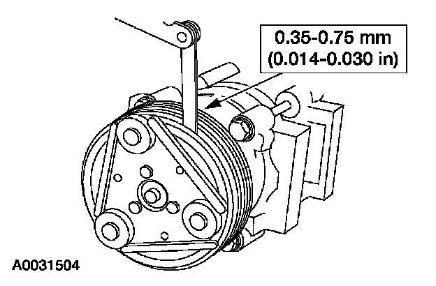 2. Remove the A/C clutch. Add or remove spacers between the A/C clutch and the compressor shaft until clearance is within specification.
