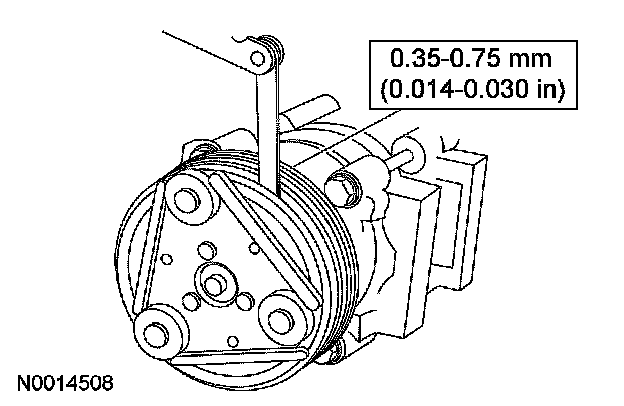 7. Measure and adjust the clutch air gap by adding or removing A/C clutch disc and hub spacers.