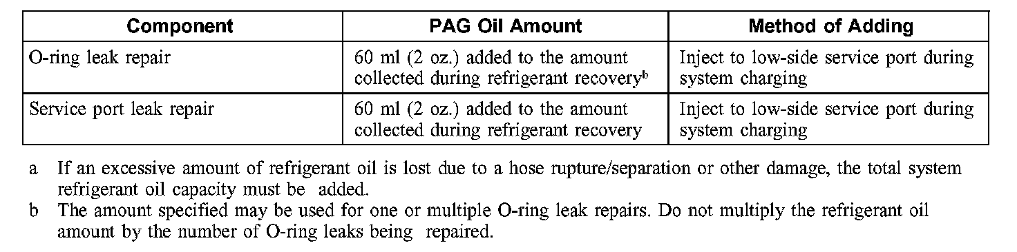 CAUTION: During normal A/C operation, oil is circulated through the system with the refrigerant, and a small amount is retained in each component. If certain components of the system are removed, some of the refrigerant oil will go with the component. To maintain the original total oil charge, it is necessary to compensate for the oil lost by adding oil to the system with the new part.