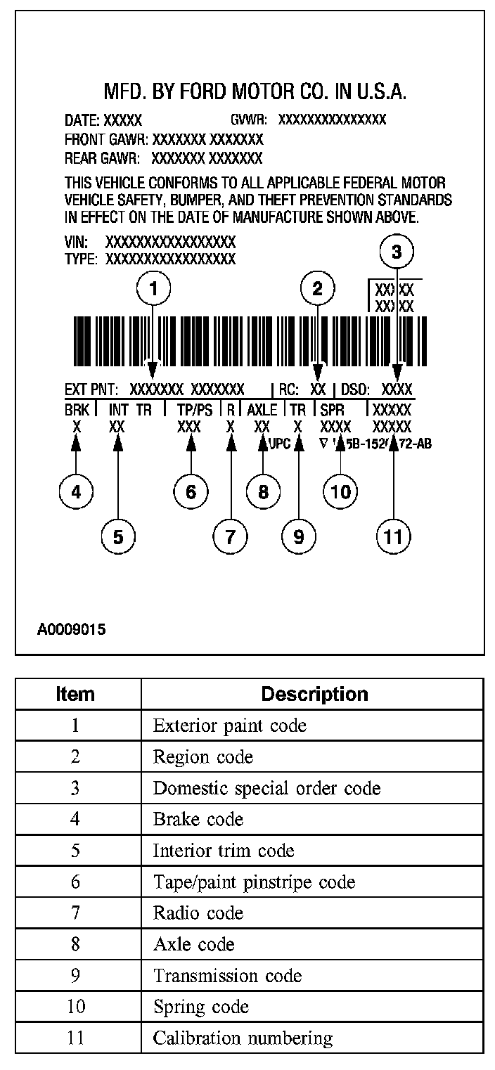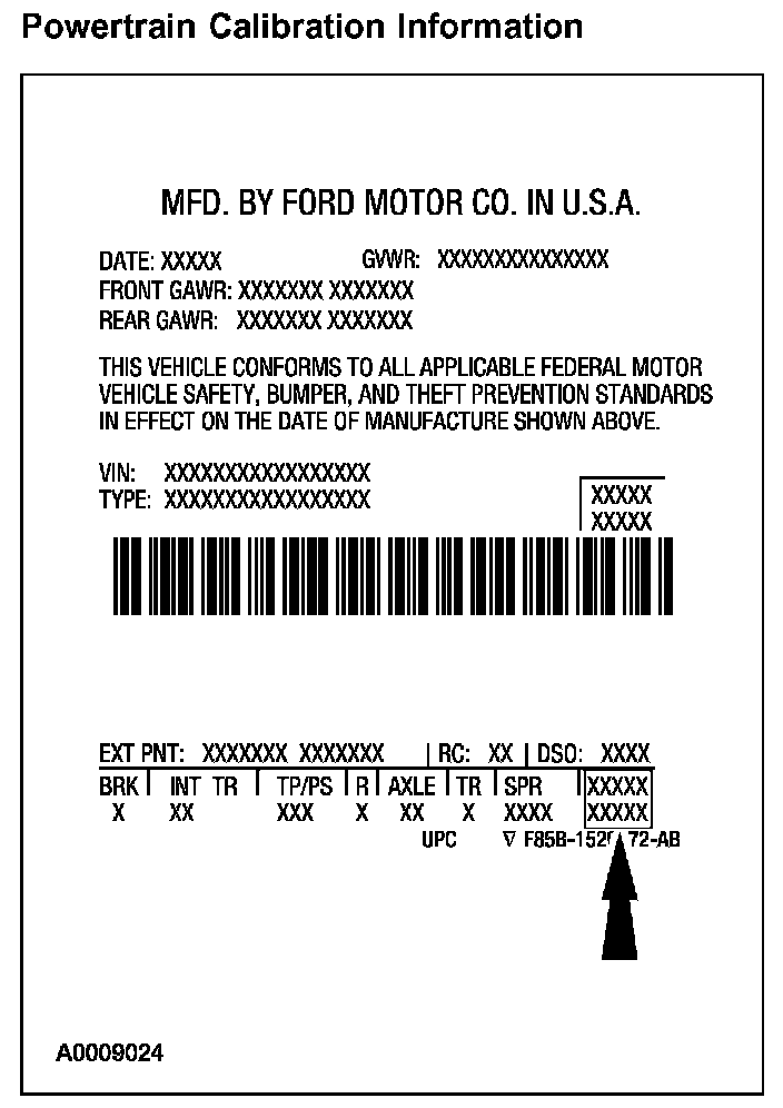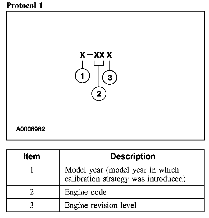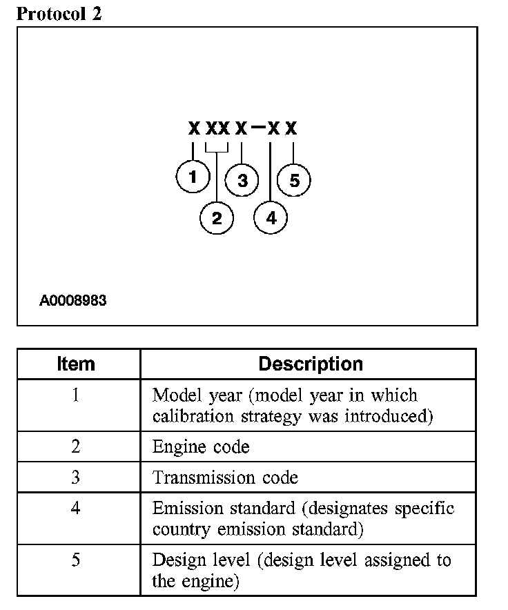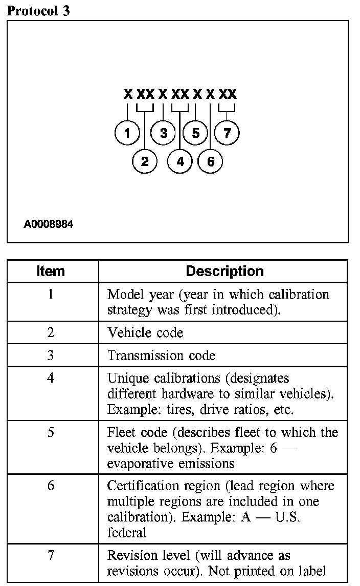 Powertrain calibration information is printed in the lower right corner of the VC label. Only the base calibration information is printed. Revision levels will not appear, however, they can be found in On Line Automotive Service Information System (OASIS). For the current model year, Ford Motor Company is using three different protocols which describe powertrain base calibration. These protocols are designed to provide worldwide standardization for vehicle calibration. If the electronic calibration strategy has been used since 1998 and carried into the current model year, Protocol 1 will be used. Refer to Protocol 1. If the electronic calibration strategy has been used since 1999 and is carried into the current model year, Protocol 2 will be used. Refer to Protocol 2. For electronic calibration strategies introduced in 2000 or later model years, Protocol 3 will be used. Refer to Protocol 3.