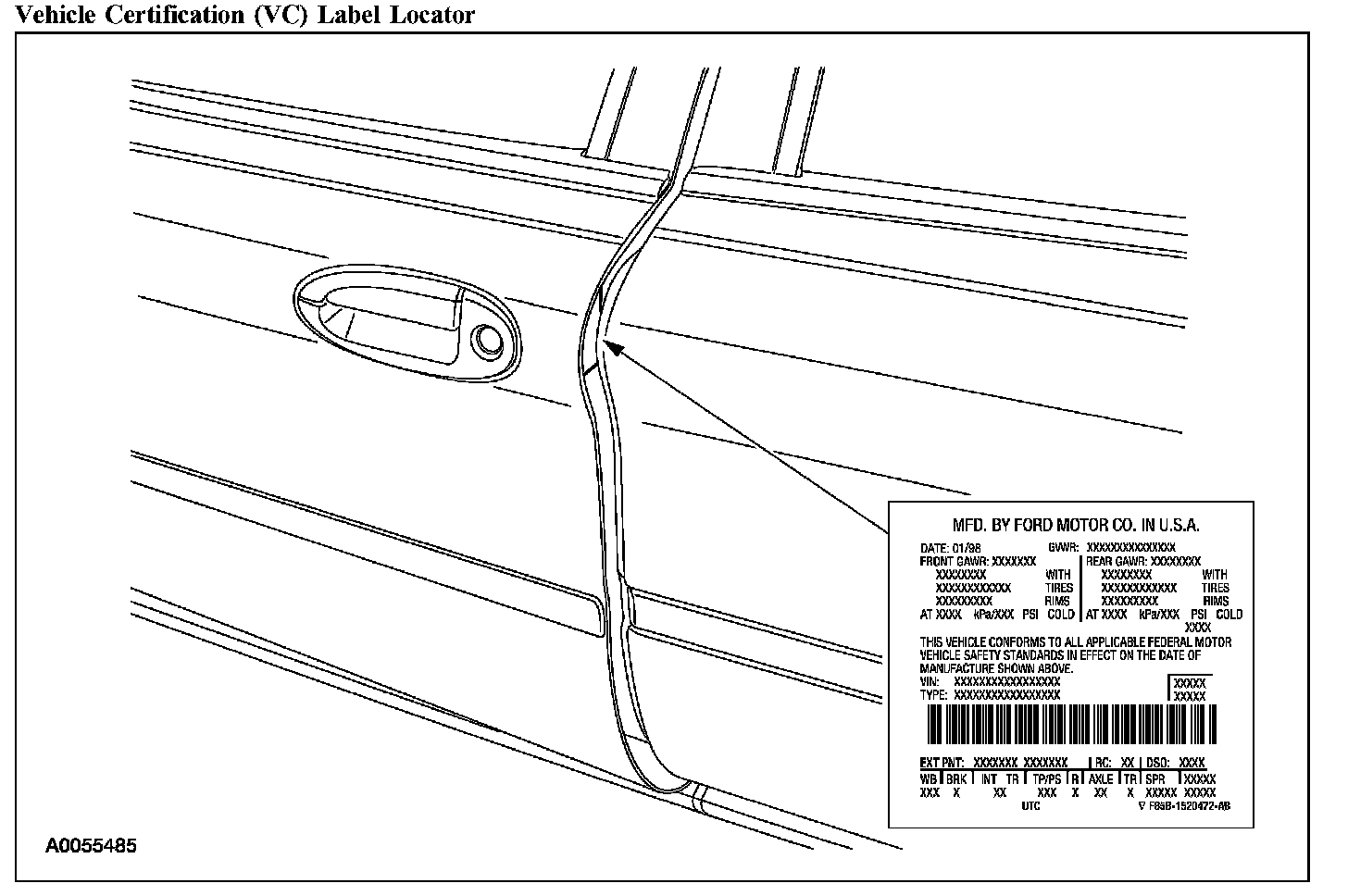 The vehicle certification (VC) label contains the manufacturer name, the month and year of manufacture, the certification statement, and the VIN. It also includes gross vehicle weight ratings (GVWR).