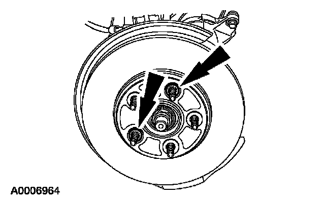 3. NOTE: If the brake disc will not come off, lubricate the brake disc where it contacts the hub assembly using Silicone Brake Caliper Grease and Dielectric Compound WA10 (D7AZ-19A331-A) or equivalent meeting Ford specification ESE-M1C171-A. Strike the disc between the wheel bolts with a plastic hammer. If this does not work, attach 2-3 jaw puller 205-D027 (D80L-1013-A) or equivalent and remove the brake disc.