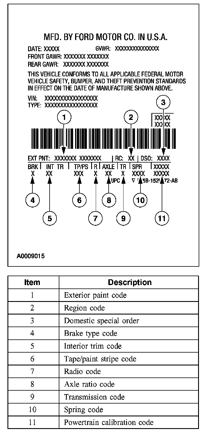 Powertrain calibration information is printed in the lower right corner of the VC label. Only base calibration information is printed. Revision levels will not appear, however, they can be found in On Line Automotive Service Information System (OASIS). For the current model year, Ford Motor Company is using three different protocols which describe powertrain base calibration. These protocols are designed to provide worldwide standardization for vehicle calibration. If the electronic calibration strategy was introduced in 1998 and carried into the current model year, Protocol 1 will be used. Refer to Protocol 1. If the electronic calibration strategy was introduced in 1999 and carried into the current model year, Protocol 2 will be used. Refer to Protocol 2. For electronic calibration strategy introduced in 2000 and beyond, Protocol 3 will be used. Refer to Protocol 3.