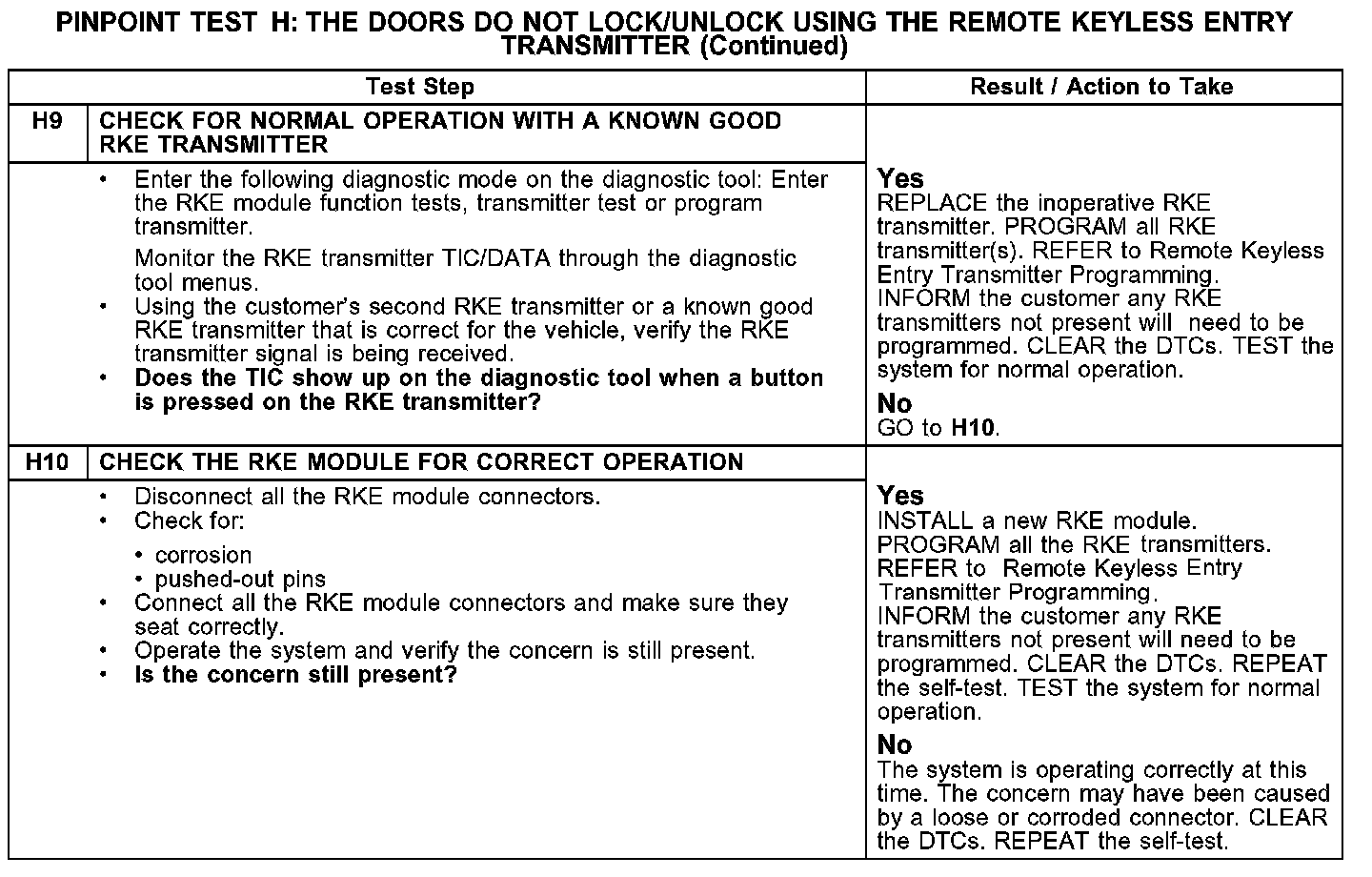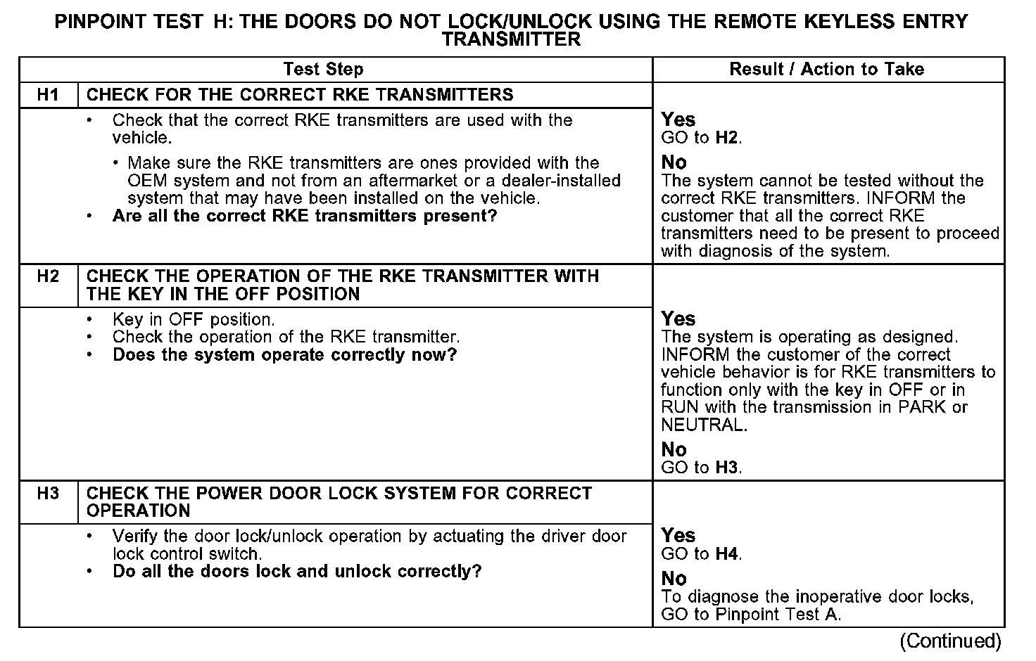 PINPOINT TEST H: THE DOORS DO NOT LOCK/UNLOCK USING THE REMOTE KEYLESS ENTRY TRANSMITTERH1-H3:
