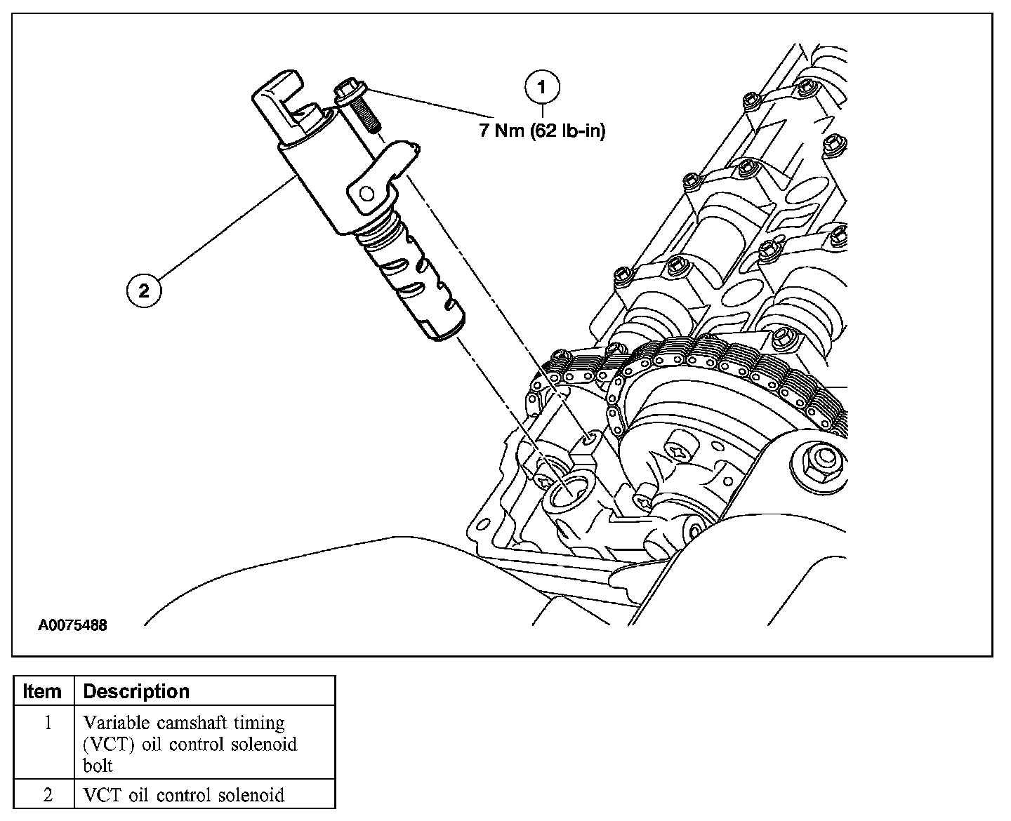 2. Remove the bolt and the variable camshaft timing (VCT) oil control solenoid.