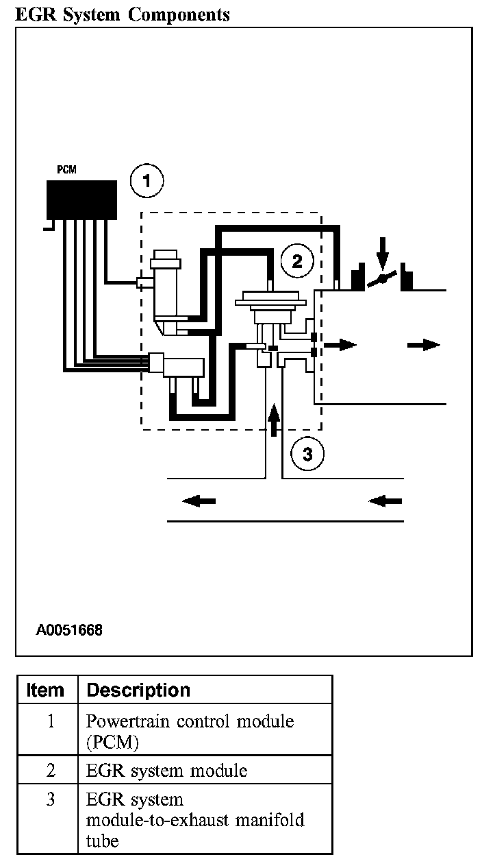 The powertrain control module (PCM) controls the EGR vacuum regulator solenoid. The EGR vacuum regulator solenoid controls the vacuum to the EGR system module. When the EGR valve opens, exhaust gas flows to the intake manifold. The differential pressure feedback sensor measures the flow through the EGR valve from the exhaust manifold tube and sends a signal to the PCM. A metering orifice in the EGR valve-to-exhaust manifold tube restricts the flow rate when the EGR valve is open.
