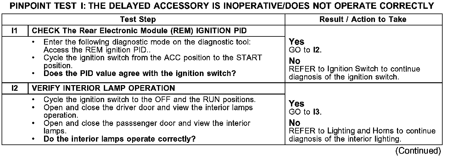 PINPOINT TEST I: THE DELAYED ACCESSORY IS INOPERATIVE/DOES NOT OPERATE CORRECTLYI1-I2: