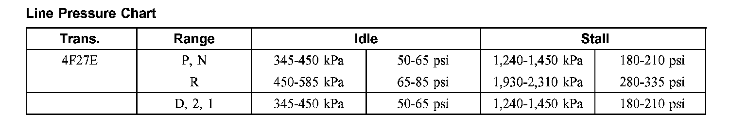 Line Pressure TestCAUTION: Carry out the Line Pressure Test prior to carrying out the Stall Speed Test. If line pressure is low at stall, do not carry out the Stall Speed Test or further transaxle damage will occur. Do not maintain wide open throttle in any gear range for more than 5 seconds.