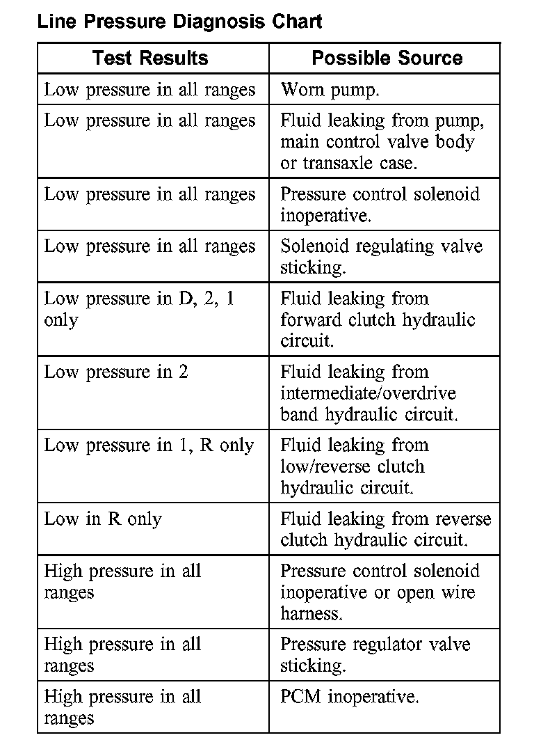 2. Start engine and check line pressures. Refer to the Line Pressure Chart to determine if line pressure is within specifications.