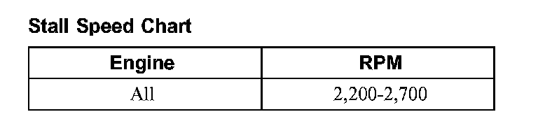 Press accelerator pedal to floor (WOT), in each range. Record RPM reached in each range. Stall speeds should be as follows: