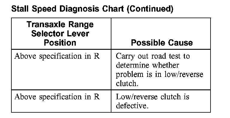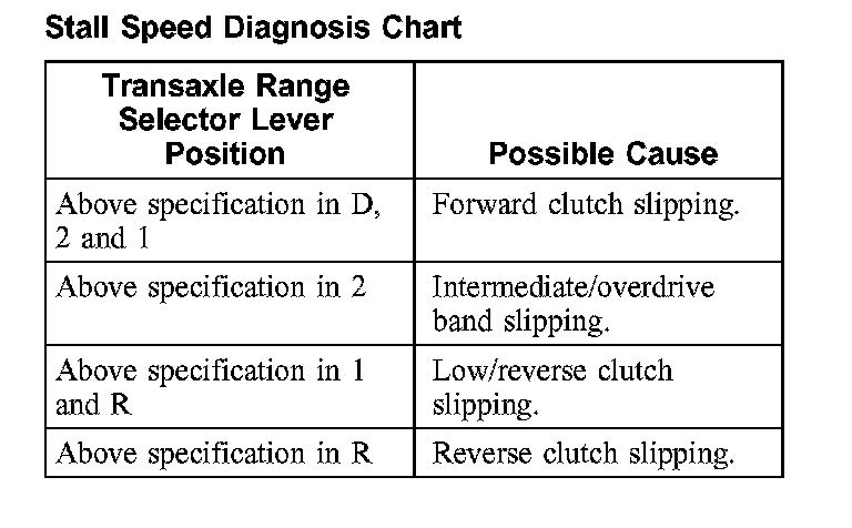 3. If stall speeds were too high, refer to the Stall Speed Diagnosis Chart. If stall speeds were too low, first check the engine idle speed. If engine idle is OK, remove torque converter and check the torque converter one-way clutch for slippage.