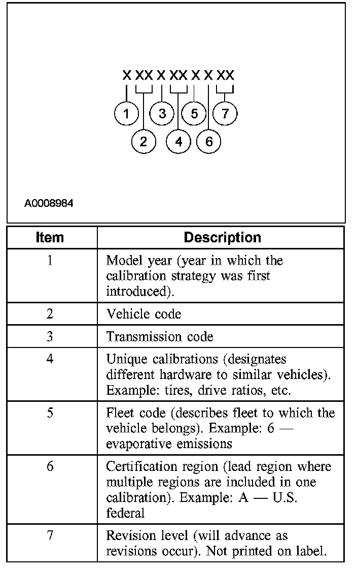 NOTE: Powertrain calibration information is limited to a maximum of 5 characters per line on the vehicle certification (VC) label. Because of this, calibration identification consisting of more than 5 characters will wrap to the second line on the VC label.
