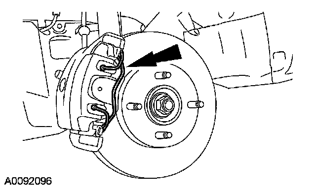 CAUTION: Do not allow the brake caliper to hang from the brake caliper flexible hose. Use a suitable tool to support the brake caliper.
