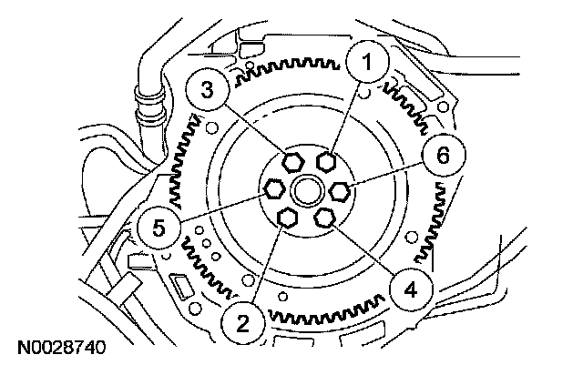 135. Install the flexplate and the 6 bolts. Tighten the bolts in the sequence shown in 3 stages: