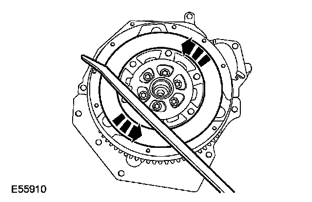 14. Using a suitable long screwdriver or bar, firmly rotate the secondary mass clockwise and counterclockwise until the dual mass flywheel friction control plate is centered between the secondary mass notches.