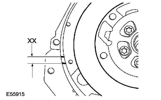21. Measure the rotational freeplay XX between the 2 reference marks on the primary mass of the dual mass flywheel. If the rotational freeplay exceeds 19 mm (0.750 inch), install a new dual mass flywheel.