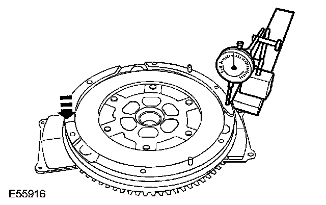 ^ Repeat this measurement at 120° intervals around the dual mass flywheel and note any deflection. If the deflection exceeds 1.5 mm (0.060 inch) at any point, install a new dual mass flywheel.