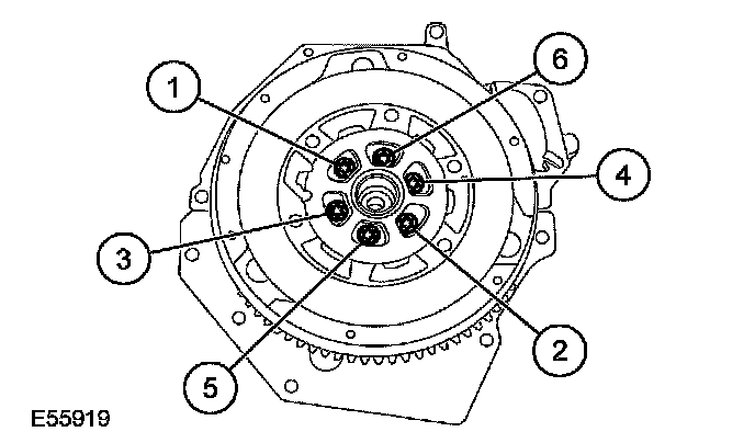 30. Tighten the dual mass flywheel retaining bolts in the sequence shown to 112 Nm (83 ft. lbs.).