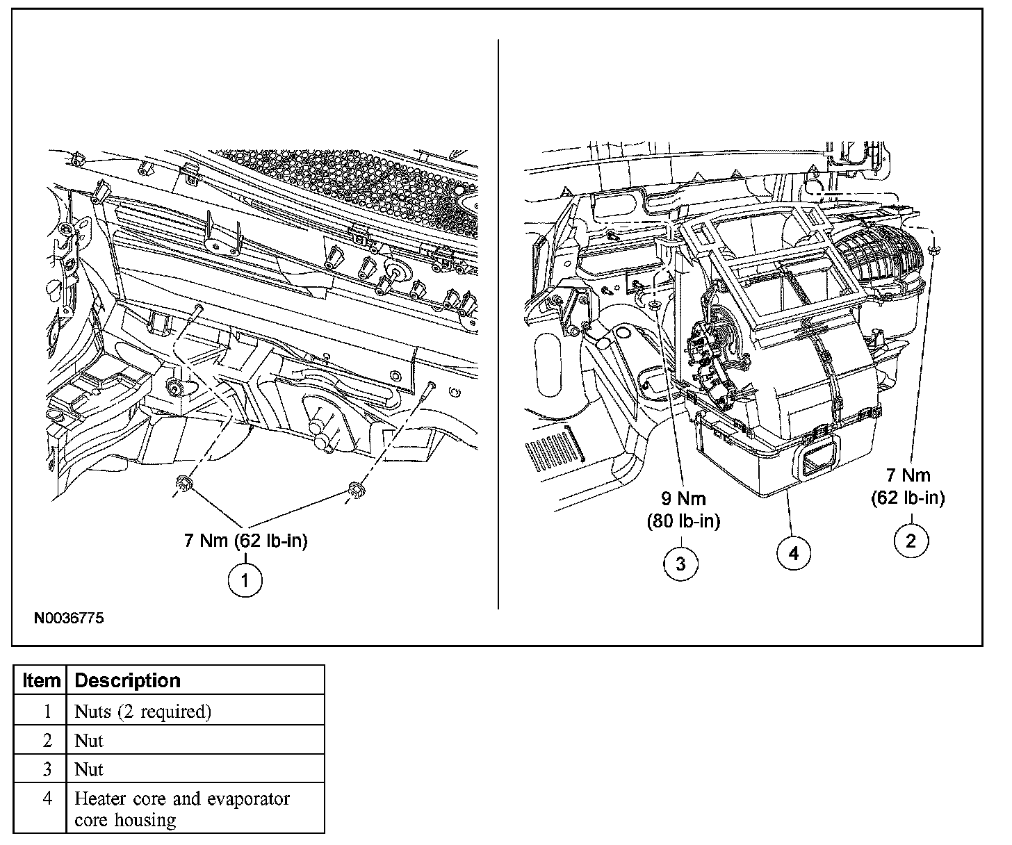 8. Remove the heater core and evaporator core housing nut at the dash panel.