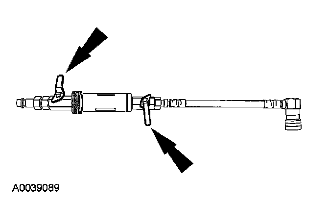 5. Install the dye/lubricant injector between the low-side service gauge port valve and the refrigerant service station or manifold gauge set.