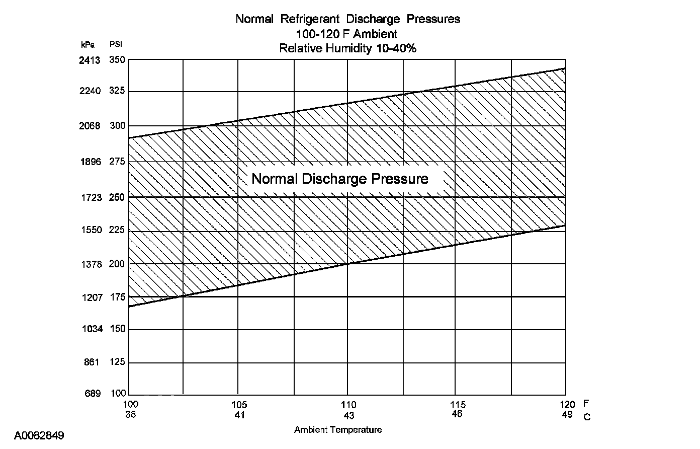 8. Determine if the discharge pressure falls within the normal operating limits using the Normal Refrigerant Discharge Pressures chart.